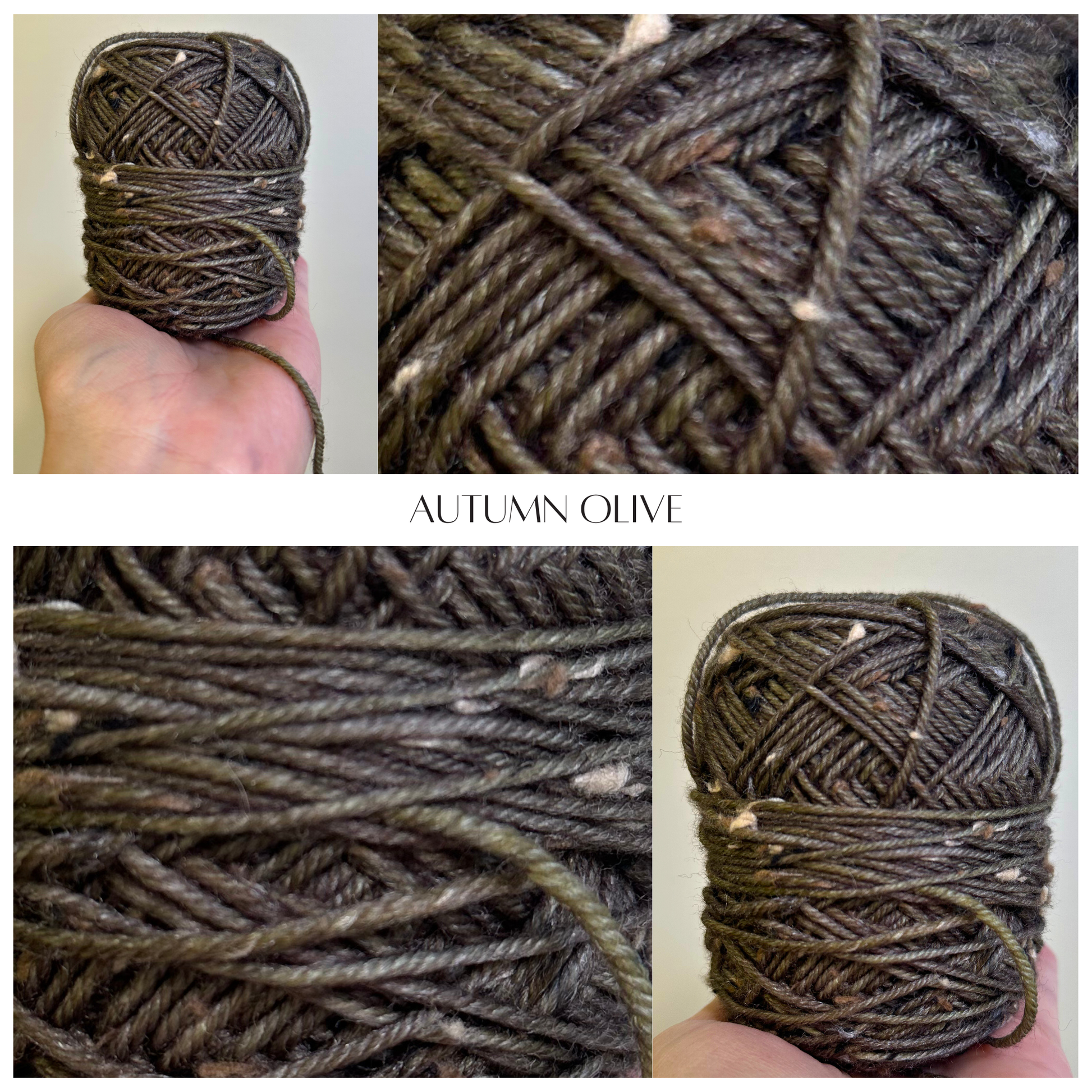 This colorway blends soft, dusky olive tones with gentle shadows of bark and moss. It feels grounded—like cool soil after rain, the hush of leaves underfoot, and the stillness that settles before winter arrives. A quiet, earthy green that pairs beautifully with neutrals and warms naturally in the hand as you knit or crochet.